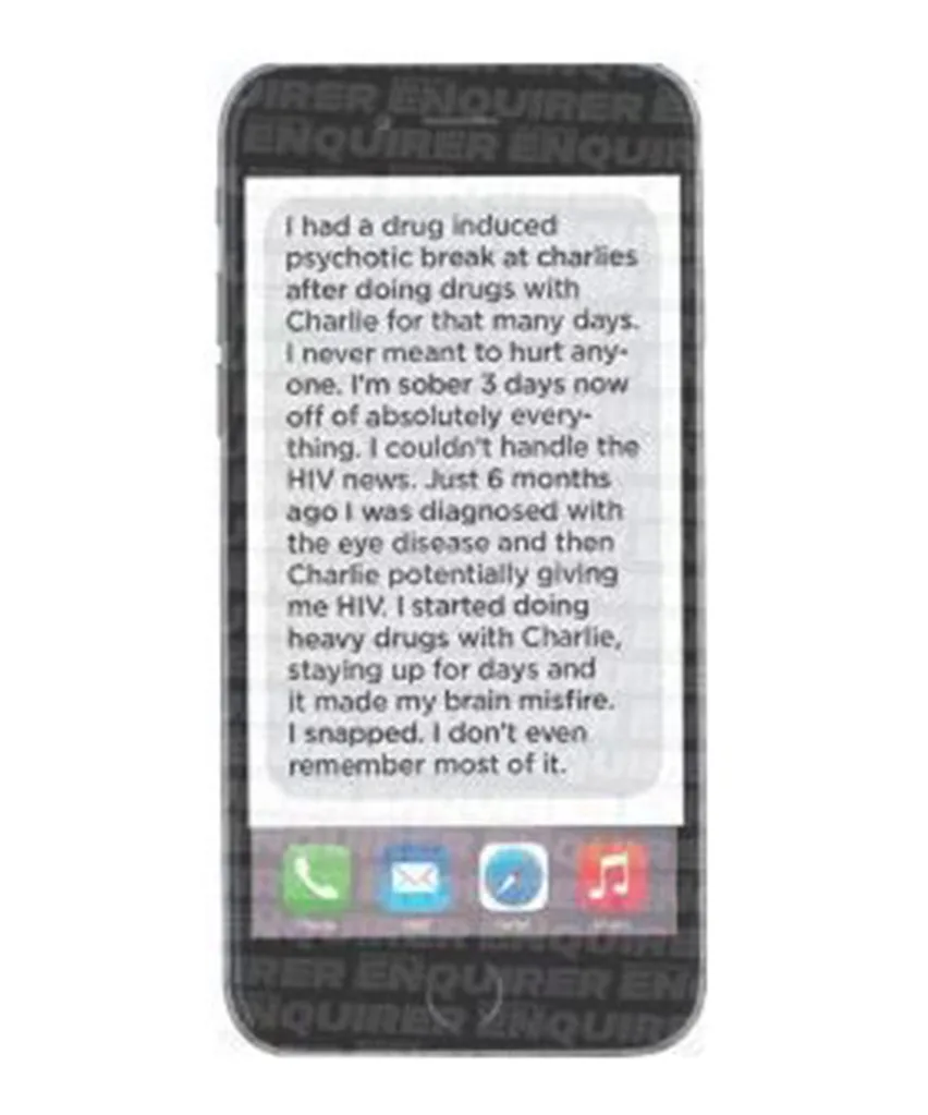 In a text message – which has been obtained by The National Enquirer, which broke the news of his HIV-positive status today – to Charlie’s now-deceased assistant, Brooke allegedly says, “I snapped… I couldn’t handle the HIV news. Just six months ago I was diagnosed with the eye disease and then Charlie potentially giving me HIV.”
