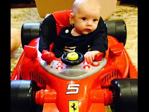 Clearly meant for big things: little Axl at two months old and already at the wheel of a Ferrari!