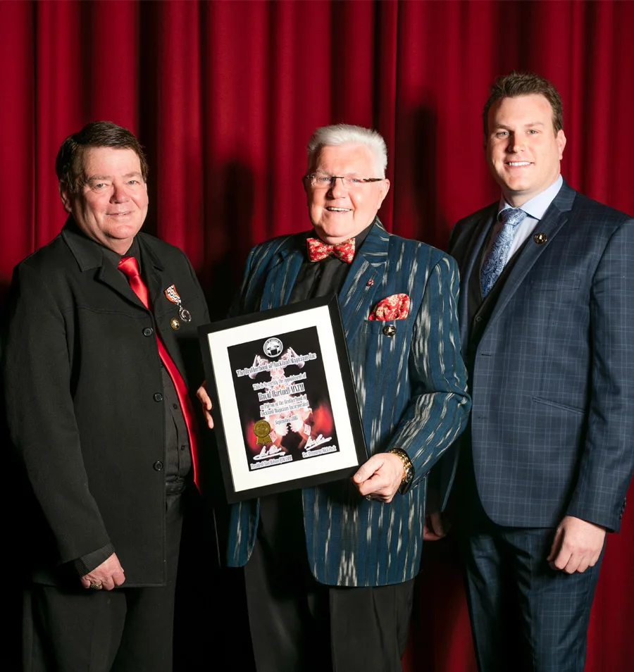 David with Brotherhood of Auckland Magicians president Alan Watson, QSM (far left) and secretary treasurer Mick Peck.