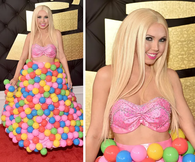 Pop artist Girl Crush showed up to the 2017 Grammy Awards in a gown that looks like it was covered in bright gumballs – a definite miss.