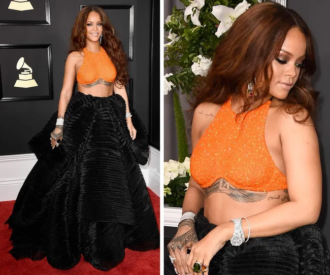 Riri was super cute in a sparkly orange Armani crop top and princess-worthy black tutu skirt