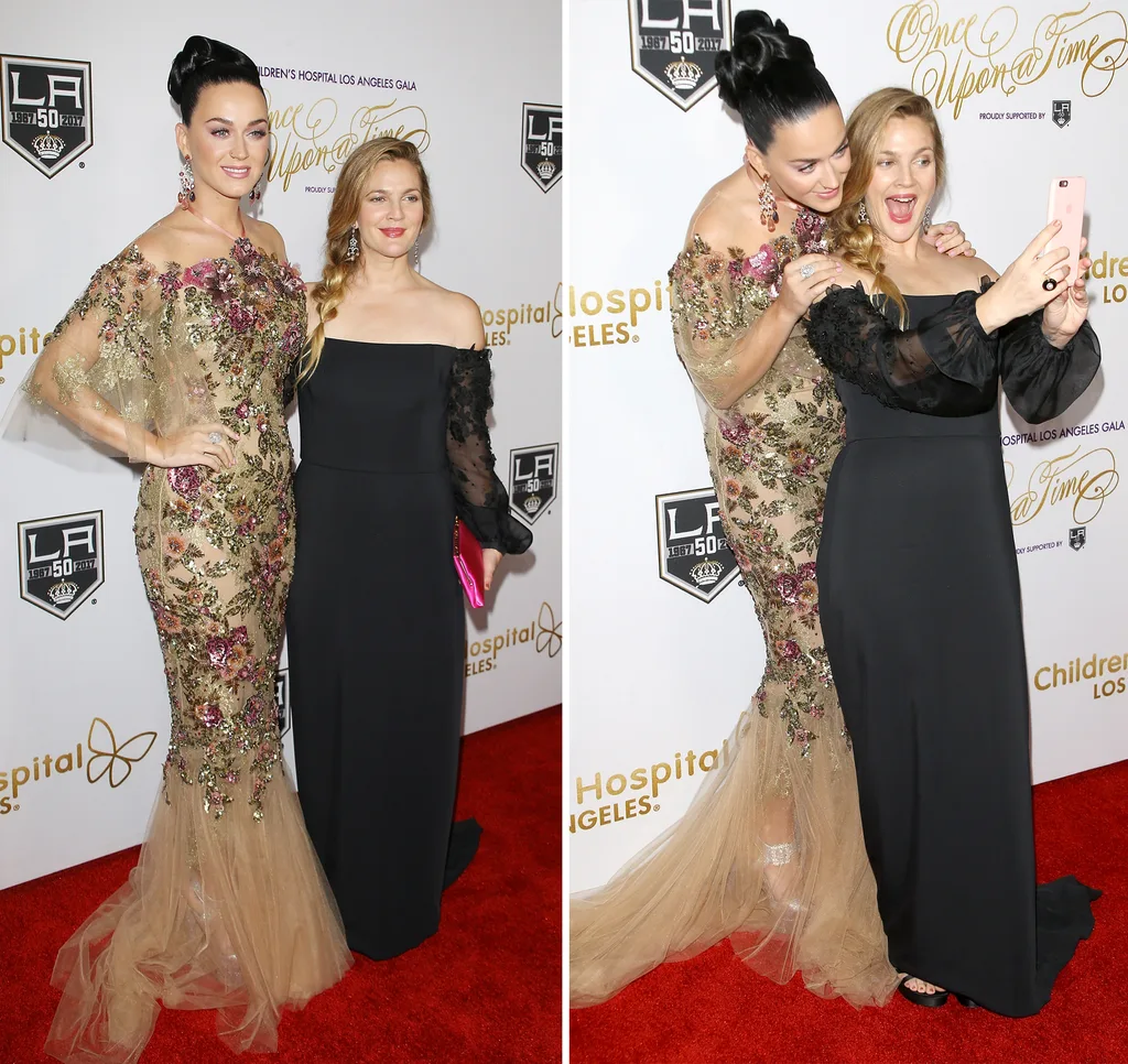 Drew and Katy got together to snap several photos – including a selfie or two! – on the red carpet. The actress was also glammed up for the charity event in an off-the-shoulder black floor-length gown with sheer sleeves.