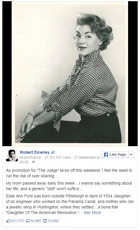 Robert, who is in the middle of promotion for his new movie The Judge, commemorated his mother’s life with his trademark quick wit.