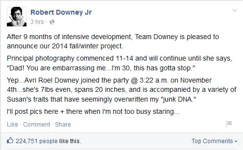 The Iron Man star announced the happy news via his Facebook page, which of course, being Robert Downey Jr, came complete with jokes: