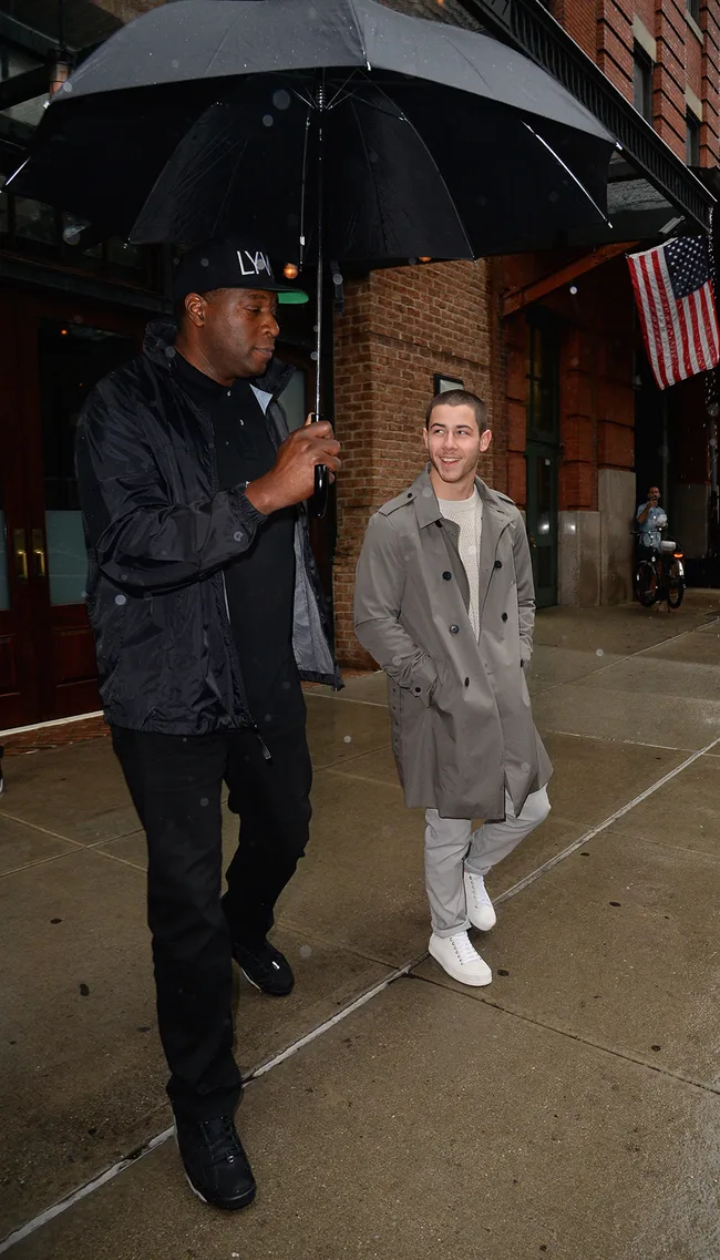 Nick Jonas gets a little help on a wet day in New York.