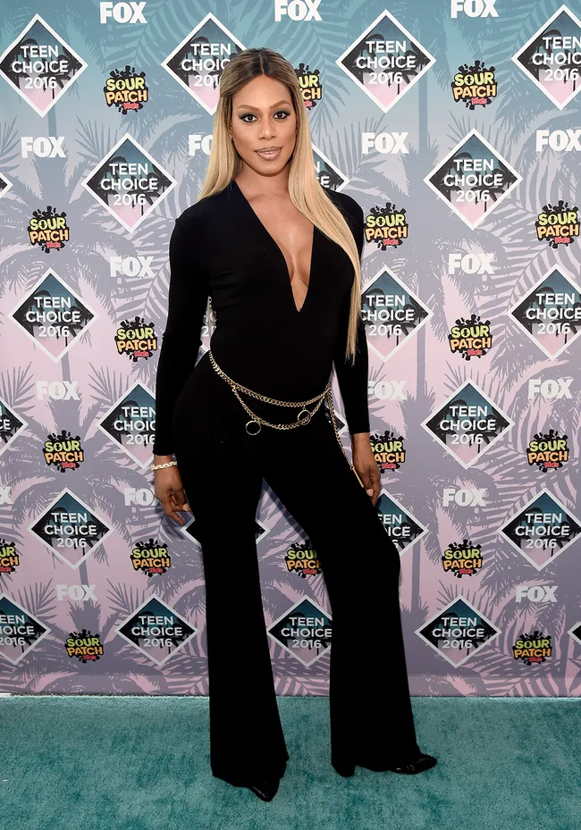 Orange Is The New Black star Laverne Cox works a black jumpsuit with a golden chain as she poses up a storm on the teal carpet.