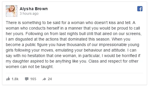 “Following on from last nights [sic] bull s–t that aired on our screens, I am disgusted at the actions that dominated this season,” she wrote on Facebook earlier today.