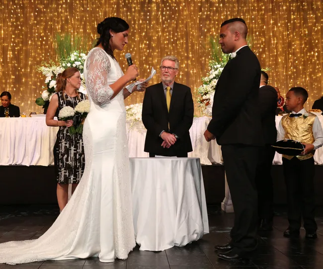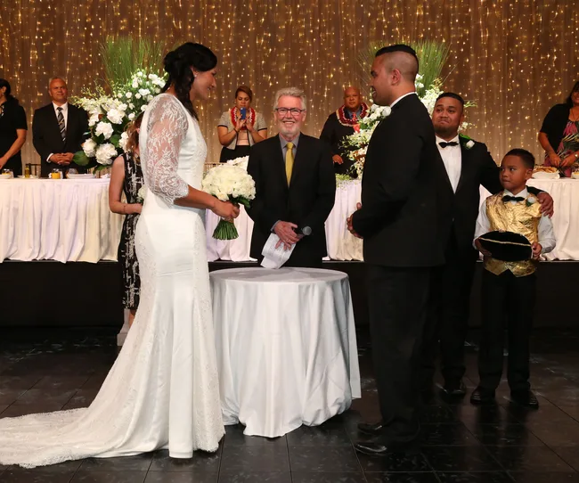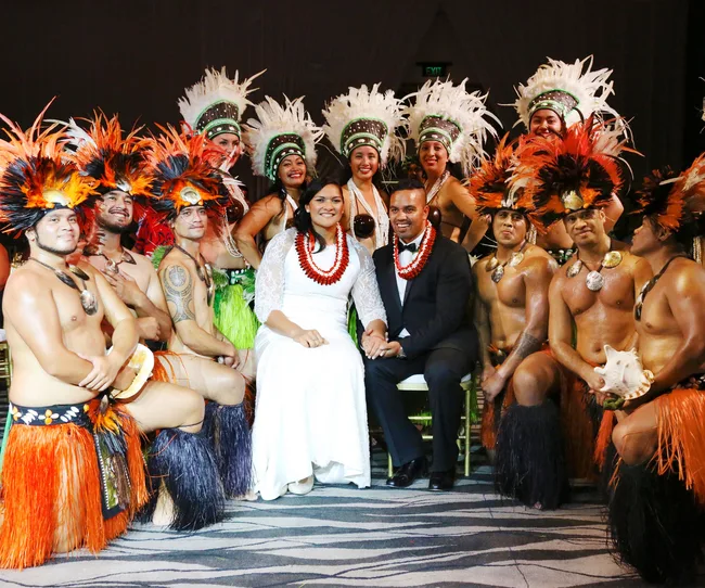 In keeping with Tongan tradition, guests shower the couple with money for their families.