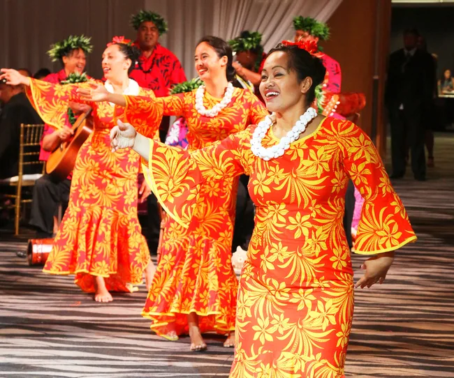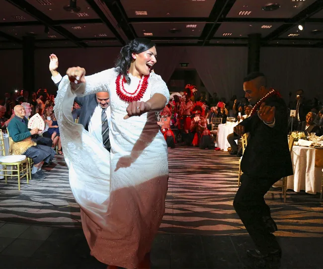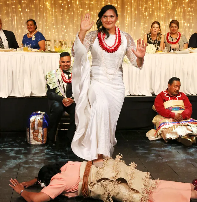 Valerie’s namesake niece Val performs a traditional tau’olunga dance in front of gifts for the bride and groom.