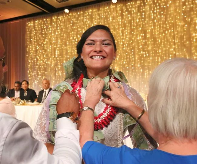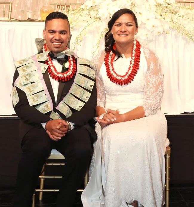 In keeping with Tongan tradition, guests shower the couple with money for their families.