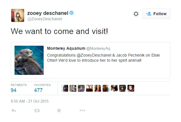 Since revealing her daughter’s name, the star has already gotten at least one friendly response from the Monterey Aquarium, which tweeted their congratulations along with a picture of two otters hugging.