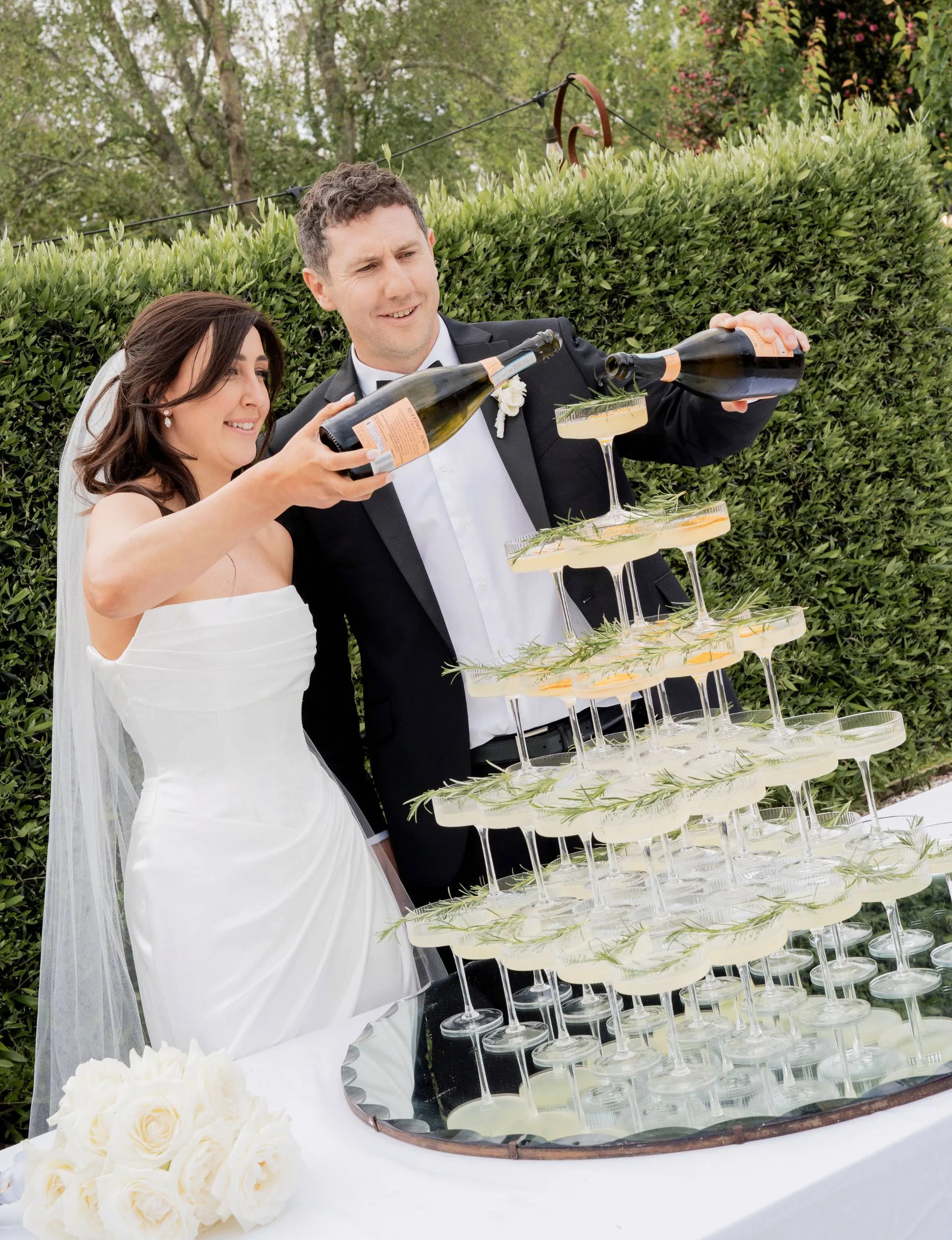 Once the formalities ended, the most Kiwi of wedding receptions kicked off, with teams from the North and South Islands competing in a “boat race” to scull drinks.