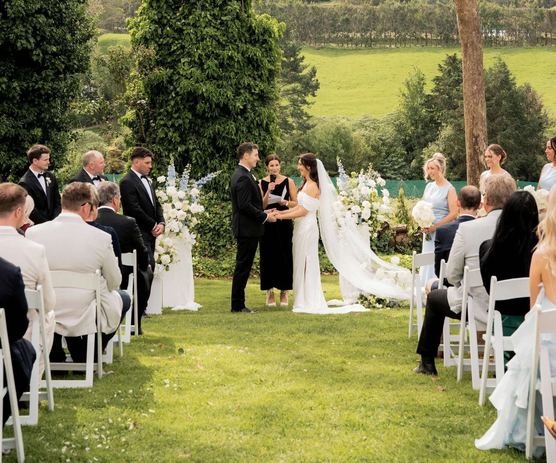 The pair’s celebrant – Michelle’s former TVNZ colleague Maddy Lloyd, the friend who inadvertently introduced the pair on her fateful blind date – welcomed everyone, before inviting the couple to exchange their self-penned vows.