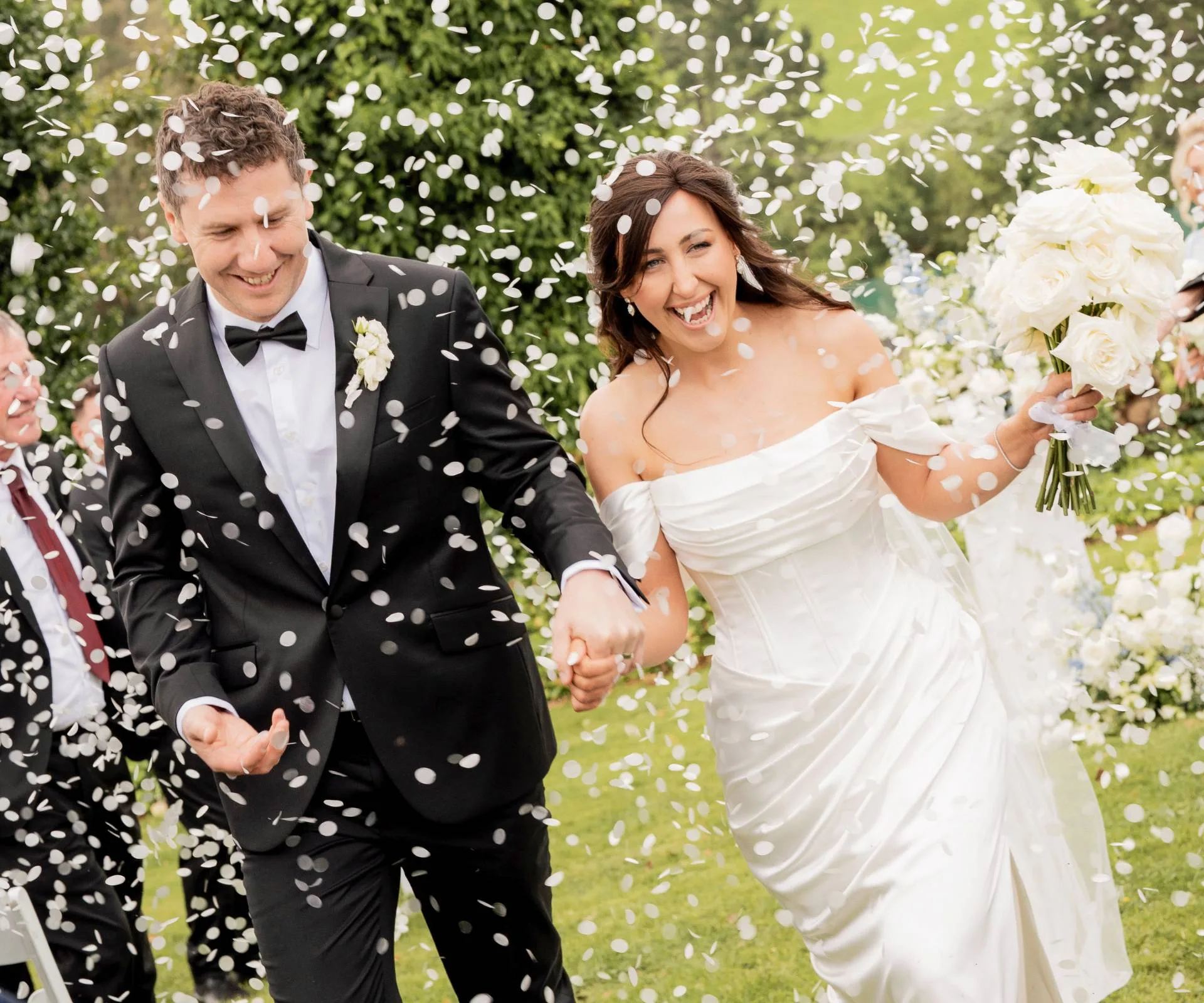 After exchanging gorgeous rings from The Diamond Shop – a custom heirloom gold band for Michelle and a titanium ring for Marty – Maddy pronounced them Mr and Mrs Banks. Walking back down the aisle to thunderous applause and clouds of hand-cut confetti to LAB’s Cassanova, the groom declared, “Now it’s time to party!”