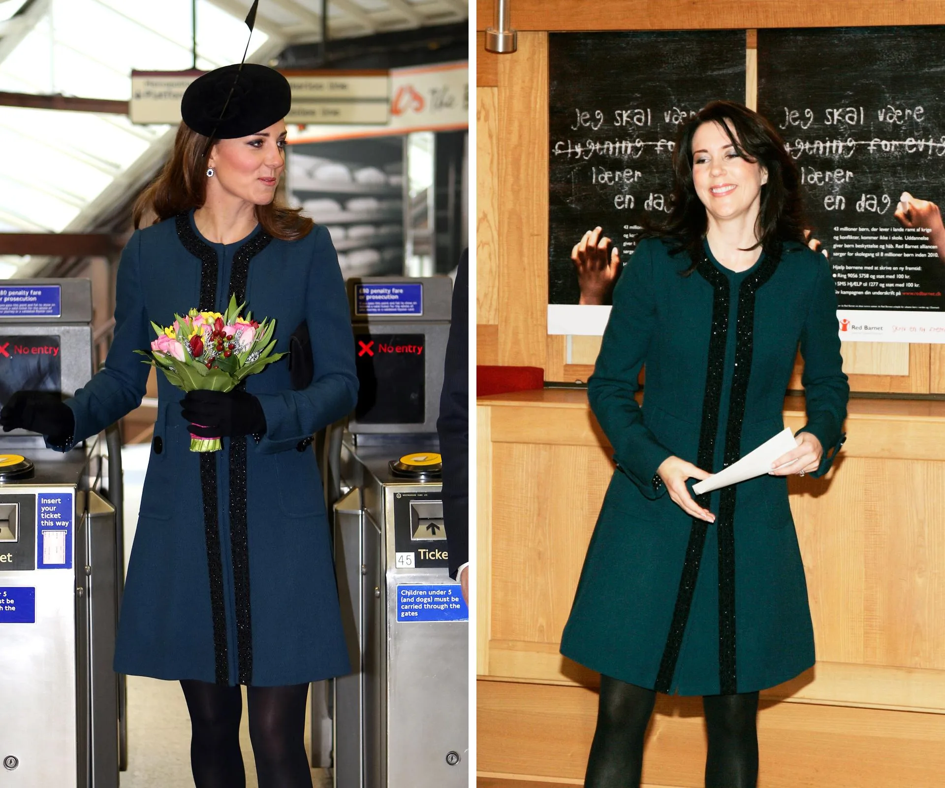 Duchess Catherine and Princess Mary looked chic in this fit and flare coat.