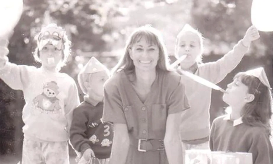 Carole is surrounded by four children, including Catherine, then seven-years-old, Pippa, four, and James, two who are blowing party horns and wearing party hats.