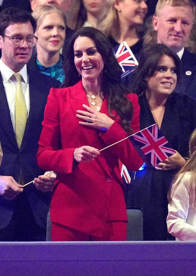 Dressed in a bold red Alexander McQueen suit, Princess Kate let her hair down as she danced with George and Charlotte.