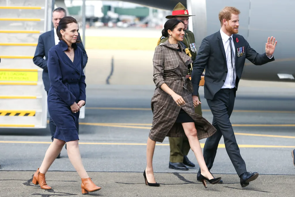 Duchess Meghan changed her outfit on the plane trip over from Sydney, and is wearing a $1000 coat from Kiwi designer Karen Walker.