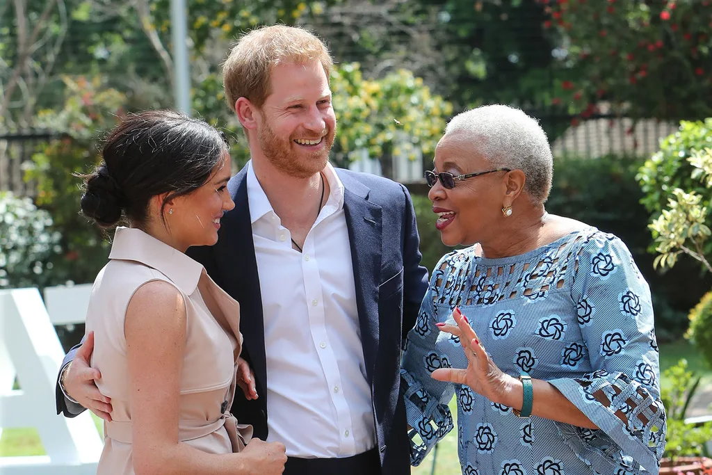 Meghan and Harry meet Graca Machel, the widow of the late Nelson Mandela. (Image: Getty)