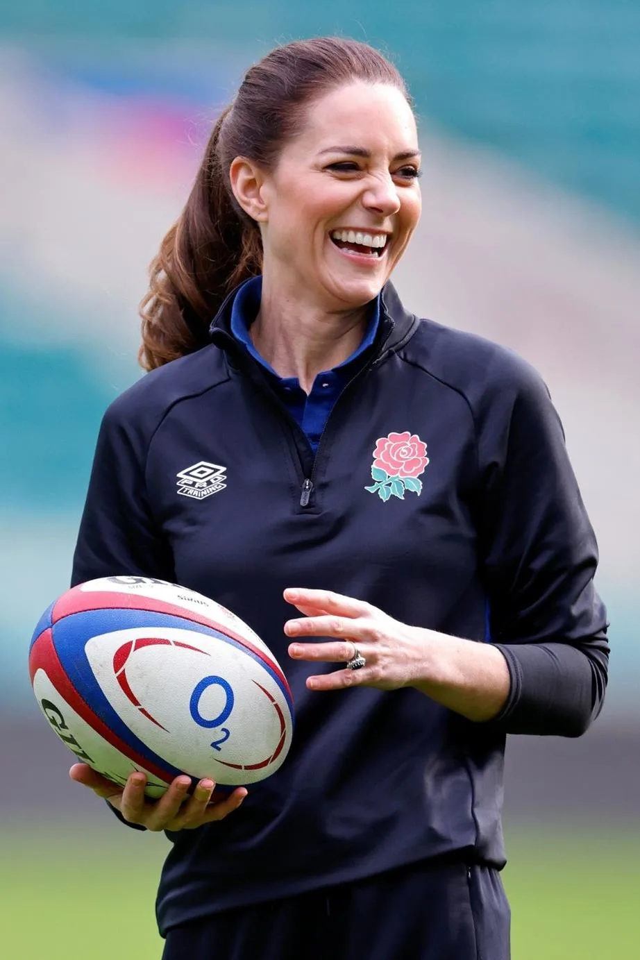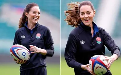 In the short clip, Catherine is decked out in an electric blue funnel turtleneck and Nike black sports pants with her hair in a half up, half-down style, as she throws a rugby ball up into the air, and a young rugby player catches it.