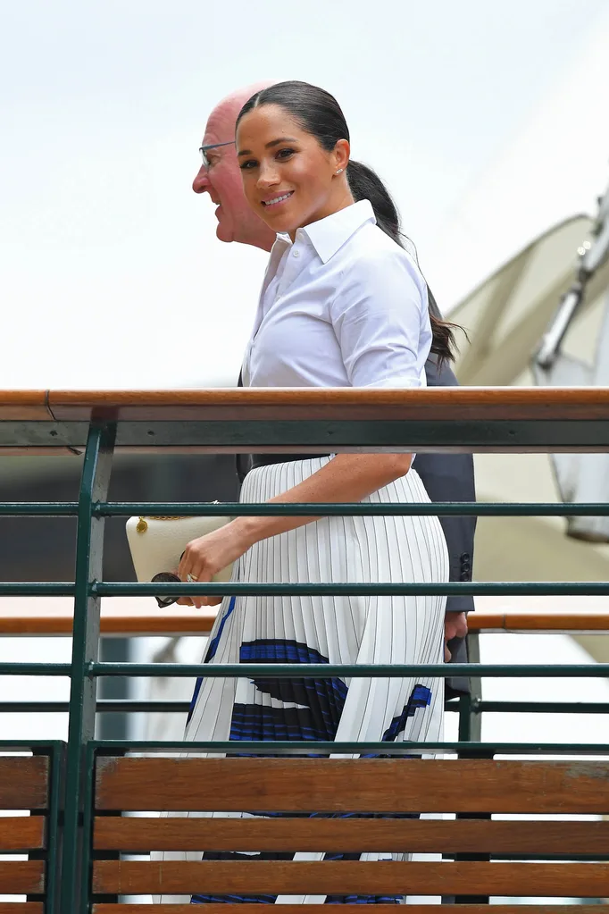 Meanwhile Duchess Meghan looked effortlessly stylish in a white shirt and pleated skirt combo.