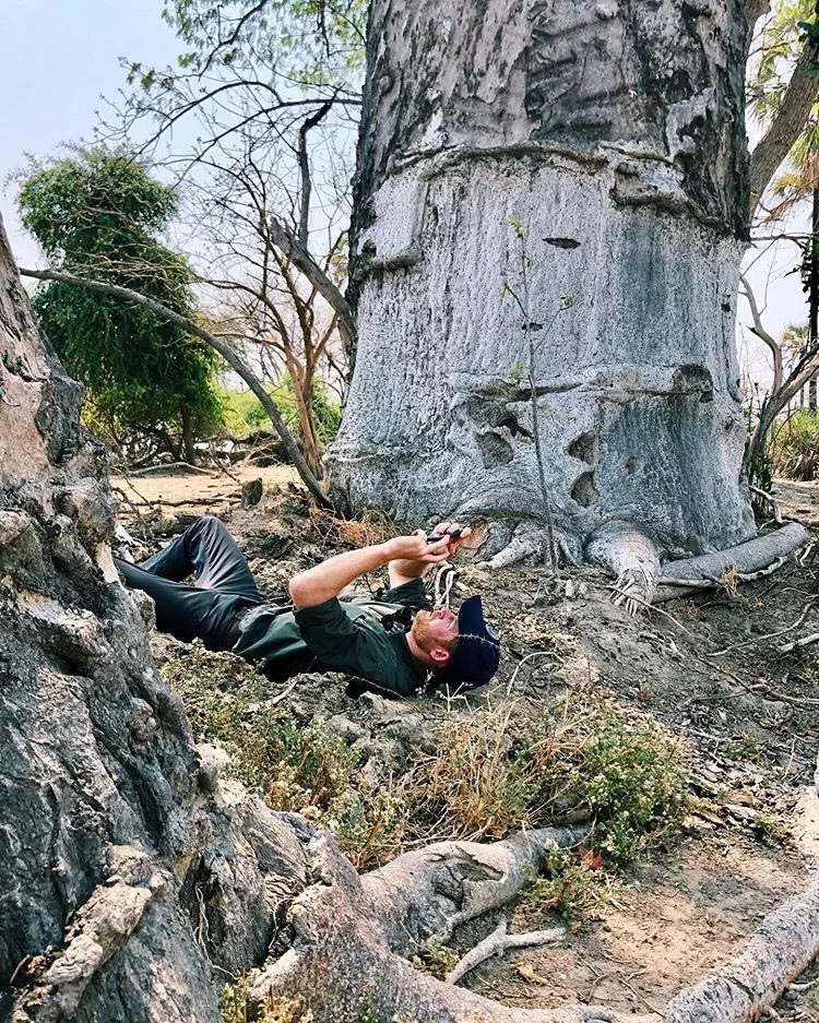 A second image in the carousel shows Harry positioned to get the perfect shot, lying on the ground beside the trees, taken by the African Parks Network.