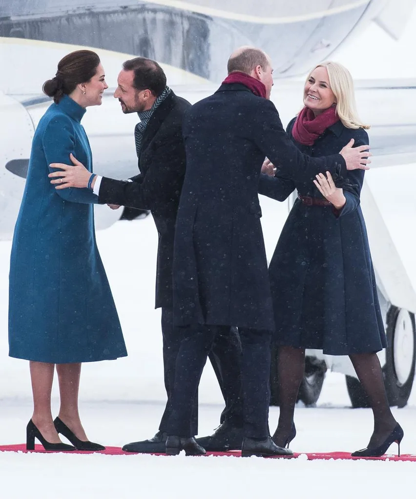 The Duke and Duchess of Cambridge were greeted by Crown Prince Haakon and Princess Mette-Marit after their private chartered plane landed at a snow-covered air force base near the Norwegian capital — luckily, a sturdy red carpet was rolled out for the royal arrival!