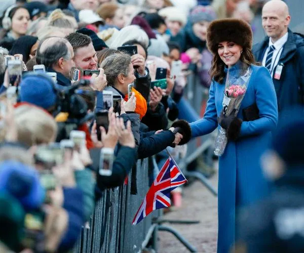 The Duchess was dressed appropriately for the snowy conditions with a cornflower blue coat, a fur hat and matching gloves.