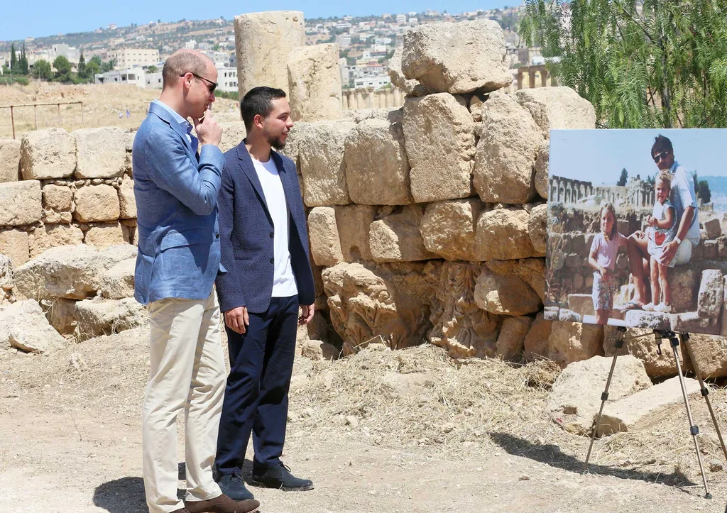 While touring the area with Crown Prince Hussein (23), he posed at the Jerash archaeological site in the same spot as Kate’s family shot was taken.
