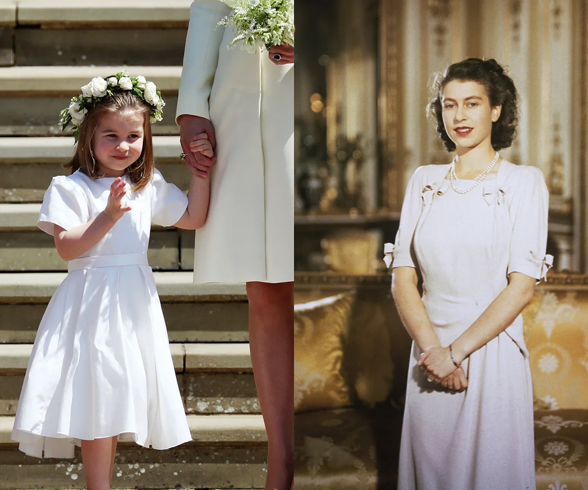 Regal in white, these images show Princess Charlotte at the royal wedding of her uncle Prince Harry and Meghan, Duchess of Sussex in May. In this image of the Queen she was still a princess. The photo was taken in 1947 at Buckingham Palace during her engagement to Prince Philip.