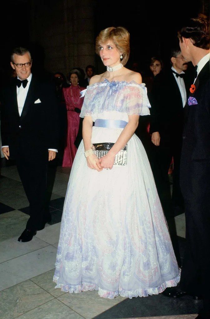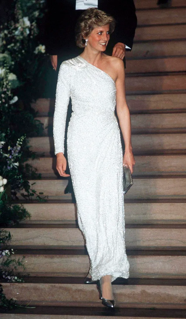 Diana dazzles in a Bruce Oldfield gown at a banquet in London in 1989 during a State visit by the ruler of The UAE. She also wore this gown to a movie premiere in 1991.