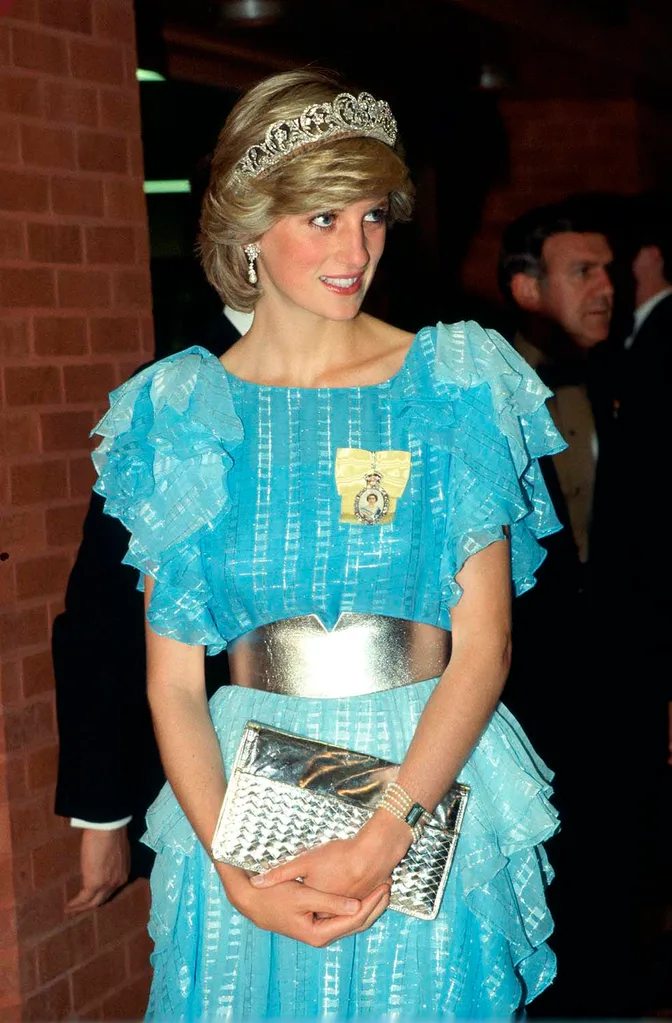 The aquamarine Bruce Oldfield gown that she wore with metallic belt and matching clutch to a formal dinner in 1983.