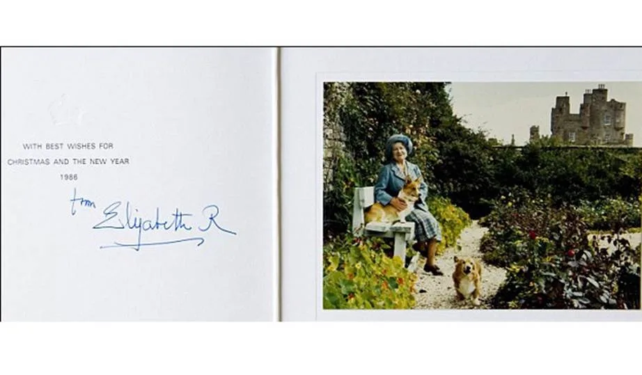 A card from the Queen Mother, posed at the Castle of Mey, with her beloved corgis in 1986.