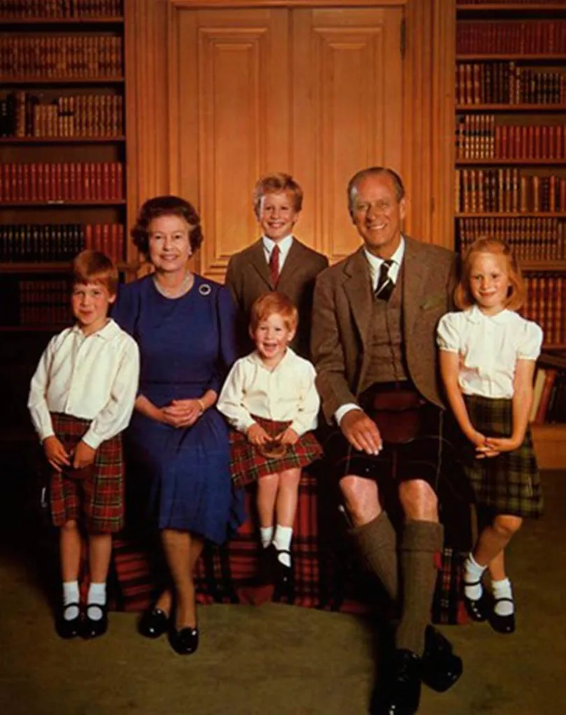 Queen Elizabeth’s Christmas card with Prince Philip and their grandchildren, Prince William and Prince Harry, and Zara and Peter Phillips and in 1987.