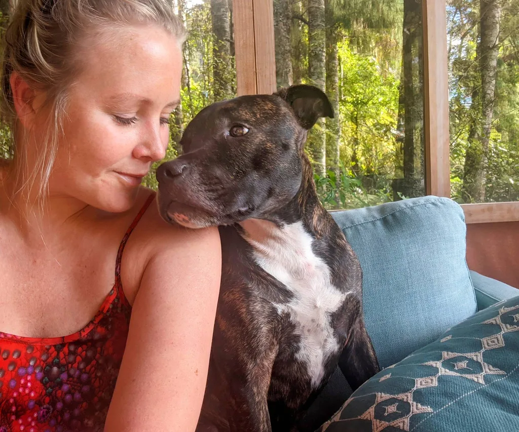 Jimi is Sally’s six-year-old Staffy, who’s wearing an elegant button-front sleeveless cardigan for the Weekly’s visit. As she mentions him, the devoted dog gazes adoringly back at his mistress.