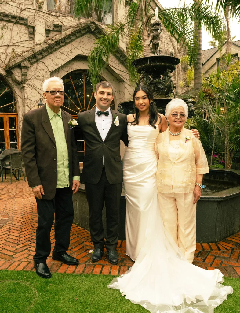Tina and Michael walked down the aisle, the bride was escorted to the altar by her grandparents Ruth and Ben, who adopted and raised her in the Philippines before the family relocated to New Zealand.