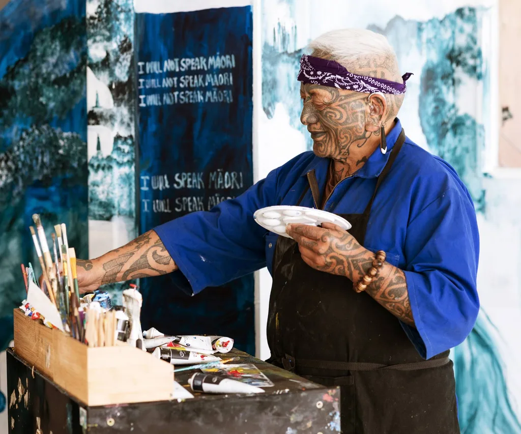 I will not speak Māori – that’s when I got canvas and paper, and started writing those words again. I realised that was going to be my artwork. That I would share my experiences and by telling that story, I could process things. You could say art saved my life.