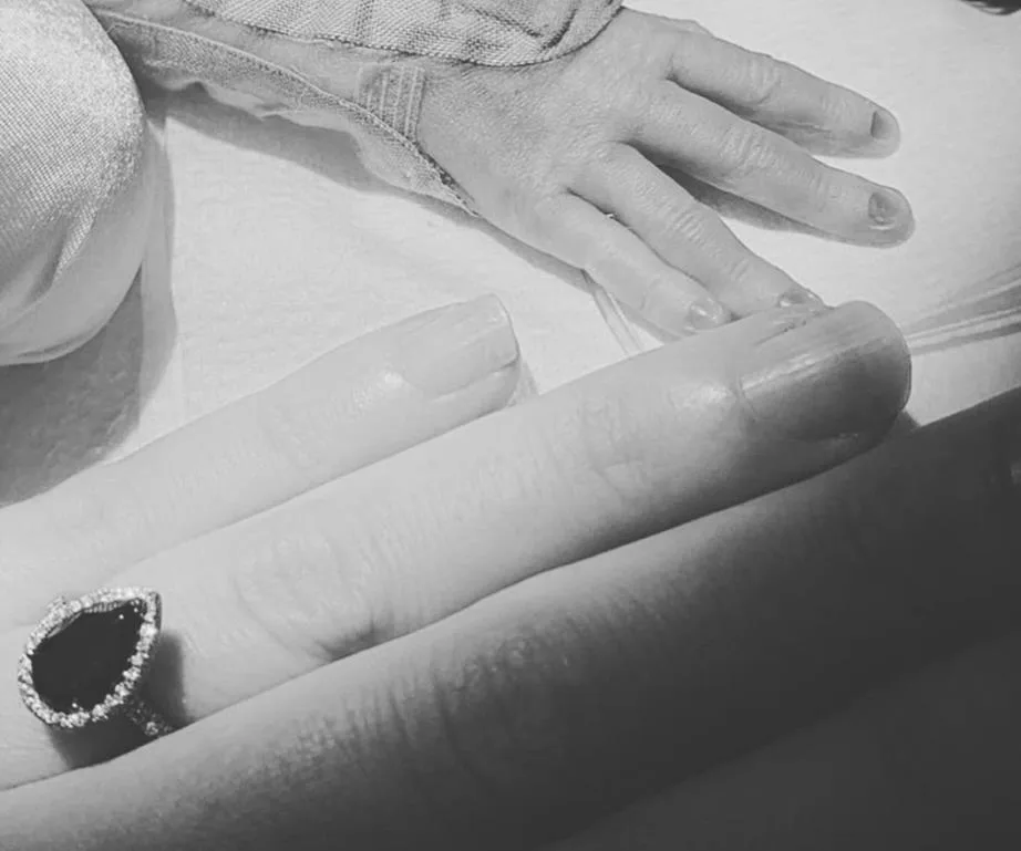 The new mum took to Instagram last night to share two close-up, black-and-white, photos of her hand alongside the tiny hands of her baby boys.