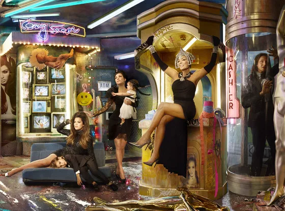 Khloe and Kourtney’s son Mason drape themselves over a chair while Kourt holds daughter Penelope, sans baby daddy Scott Disick. Ever the matriarch Kris is full of excitement while her now ex-husband, named Bruce Jenner at the time (now Caitlyn), is stuck in a glass cashier case.