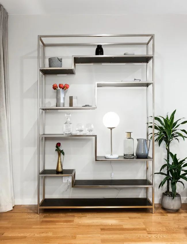 The mixed metals in the shelving and console worked well with the wood and glass textures.