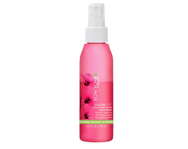 Layer your styling products, being careful not to apply too much as that will result in dull or dusty-looking hair. Begin by creating texture and finish with a product like Matrix Biolage ColorLast Shine Shake $30 to gloss up the hair.