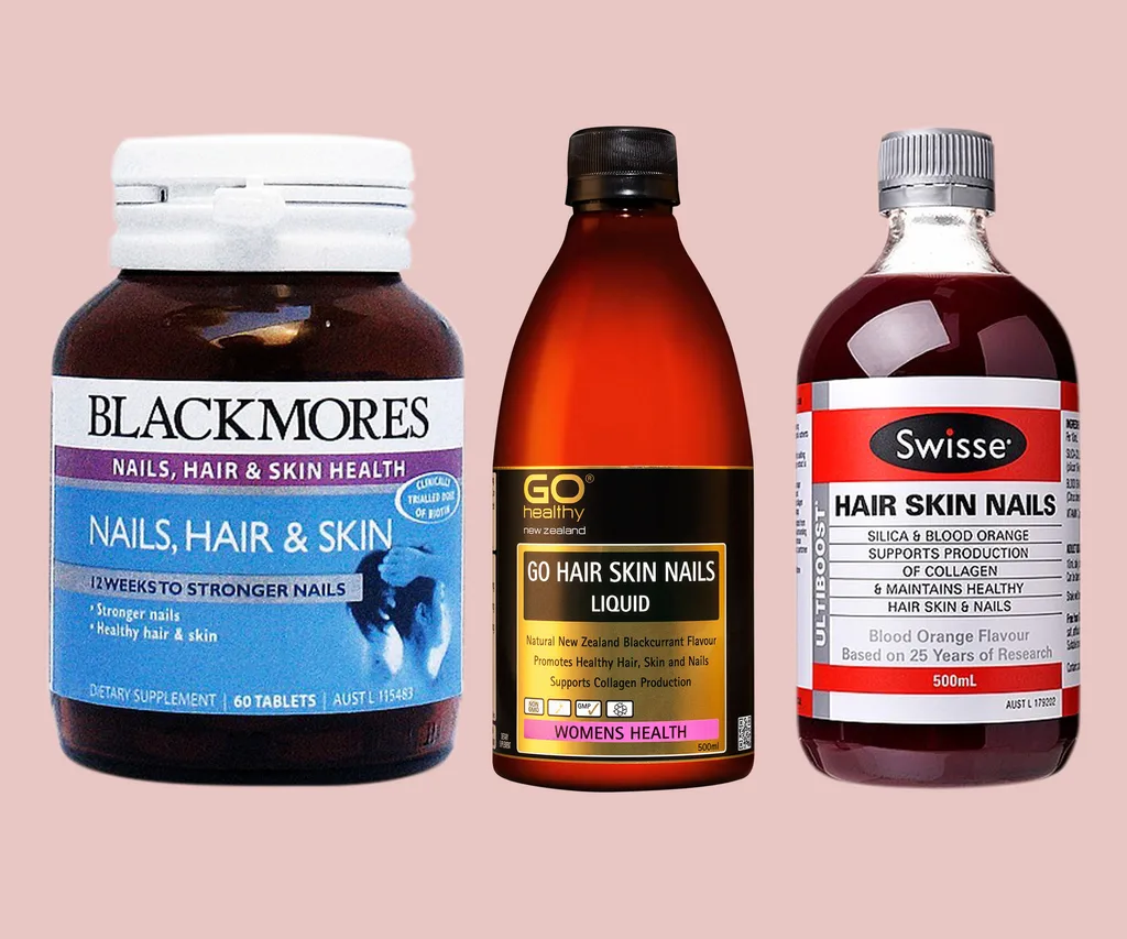 From left to right: Blackmores Nails, Hair & Skin, 60 capsules, $25.95.Go Healthy Go Hair Skin Nails Liquid, 500ml, $29.90. Swisse Hair Skin Nails liquid, 550ml, $39.90.