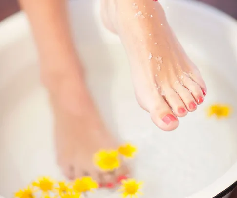 1. Start by filling a foot spa or large bowl with warm water and add your favourite foot soak product, essential oils or even Epsom salts to the water to help soften and freshen your feet. It may seem a messy step but it’s well worth the effort and will help to give you a sense of true pampering. Sit back and relax with a magazine while your feet soak for about five minutes.