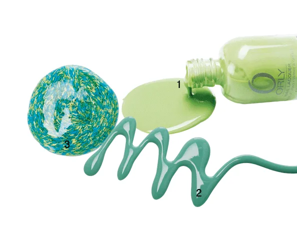 Lighten your nails with fresh sorbet shades of minty green, Orly Nail Lacquer in CoachellaDweller $24.99 (1) and Revlon Nail Enamel in Eclectic $16.50 (2). Or follow the trend for textured nails, with Sally Hansen Fuzzy Coat in Fuzz-Sea $12.99 (3).