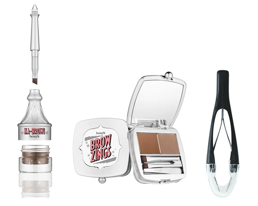 L-R: ka-BROW! eyebrow cream-gel colour, Brow Zings eyebrow shaping kit, tweezers.