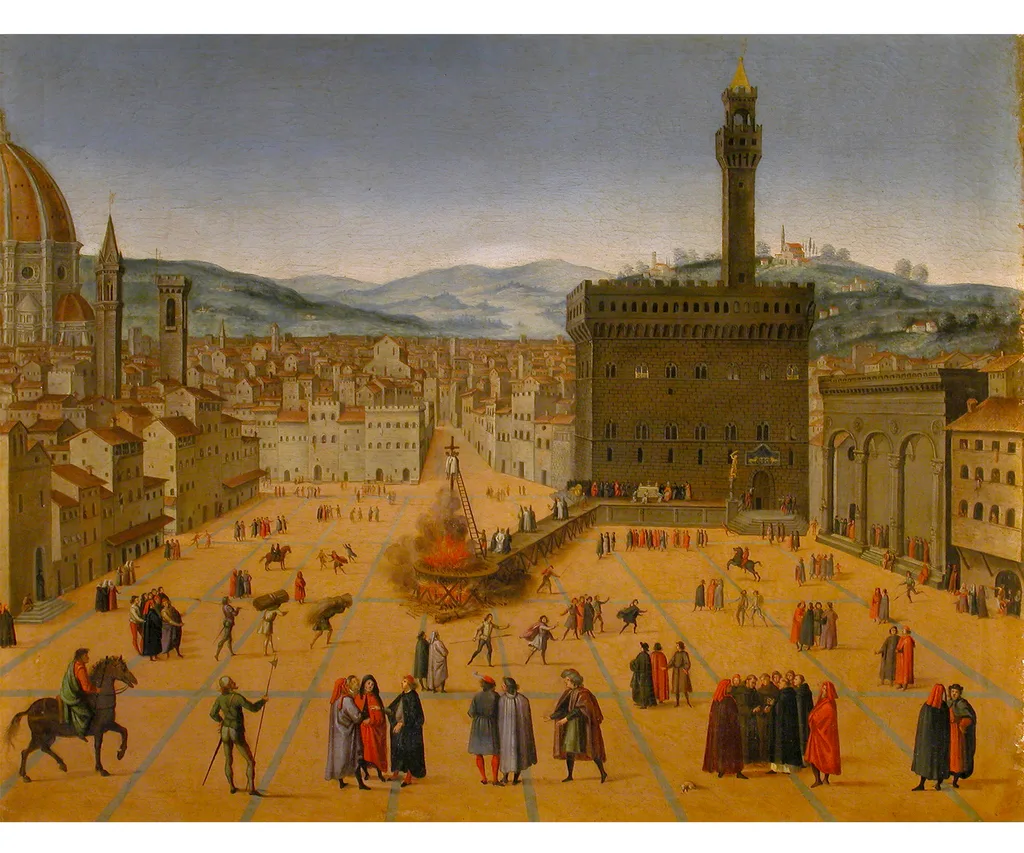 Florentine Painter after Francesco Rosselli, The Execution of Savonarola and Two Companions at Piazza della Signoria 16th–17th century, oil on canvas, Florence, Galleria Corsini.