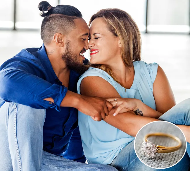 Silver Fern Cathrine Latu’s long-time love Jim Tuvaiti chose a diamond sparkler on a gold band for his romantic proposal. Photo: Woman’s Day