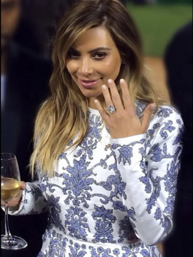 Kanye West designed Kim Kardashian’s $1.6 million 15-carat engagement ring, seen here in a photo captured by Kim’s bestie Jonathan Cheban.