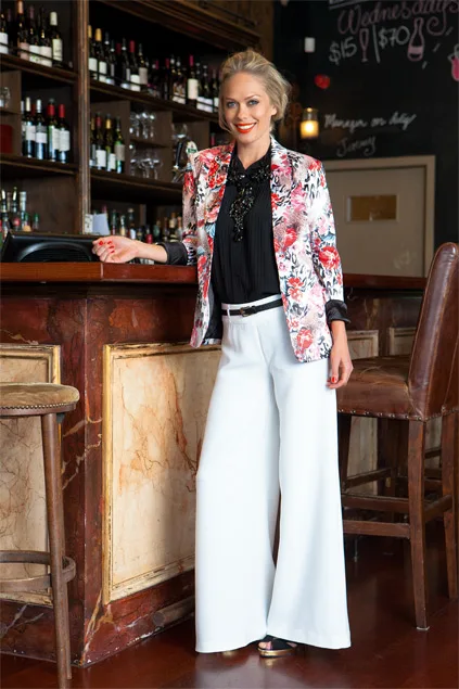 Pantsuit: I personally love a good pantsuit. It shows you have the confidence in your style to do something a little different. Stitch Ministry pleat blouse $79.99 (8-16) from Farmers. Embellished poppy collar $89.95, print blazer $170 (8-14), both from Decjuba. Stella Palazzo pant $12 (6-18) from Max. Reallife heels $209.90 from Overland.