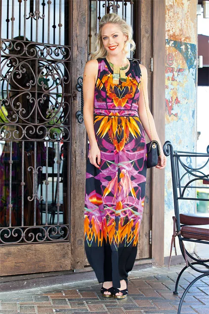 Maxi: Not everyone feels comfortable rocking a short cocktail dress, so if you like keeping your legs under wraps, choose a floor sweeping maxi. Bold prints are on trend and will give your dress an edge. Maxidress $139.99 (6-16) from Portmans. Dill chain bag $270 from Mi Piaci. Tona breastplate necklace $223 from Jessica Aggrey. Reallife heels $209.90 from Overland.
